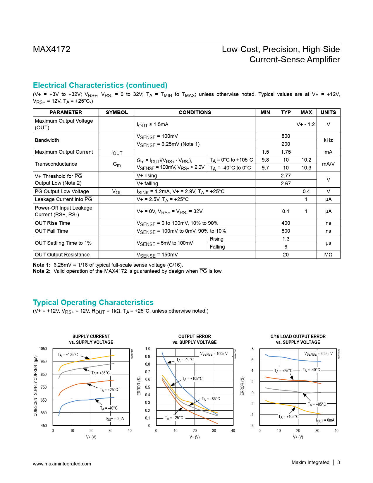 Maximum Output Voltage (OUT) IOUT ≤ 1.5mA V+ - 1.2 V V Bandwidth SENSE = 100mV 800 kHz VSENSE = 6.25mV (Note 1) 200 Maximum Output Current IOUT 1.5 1.75 mA T Transconductance G Gm = IOUT/(VRS+ - VRS-), A = 0°C to +105°C 9.8 10 10.2 m V mA/V SENSE = 100mV, VRS+ > 2.0V TA = -40°C to 0°C 9.7 10 10.3 V+ Threshold for PG V+ rising 2.77 Output Low (Note 2) V V+ falling 2.67 PG Output Low Voltage VOL ISINK = 1.2mA, V+ = 2.9V, TA = +25°C 0.4 V Leakage Current into PG V+ = 2.5V, TA = +25°C 1 µA Power-Off Input Leakage Current (RS+, RS-) V+ = 0V, VRS+ = VRS- = 32V 0.1 1 µA OUT Rise Time VSENSE = 0 to 100mV, 10% to 90% 400 ns OUT Fall Time VSENSE = 100mV to 0mV, 90% to 10% 800 ns Rising 1.3 OUT Settling Time to 1% VSENSE = 5mV to 100mV µs Falling 6 OUT Output Resistance VSENSE = 150mV 20 MΩ
