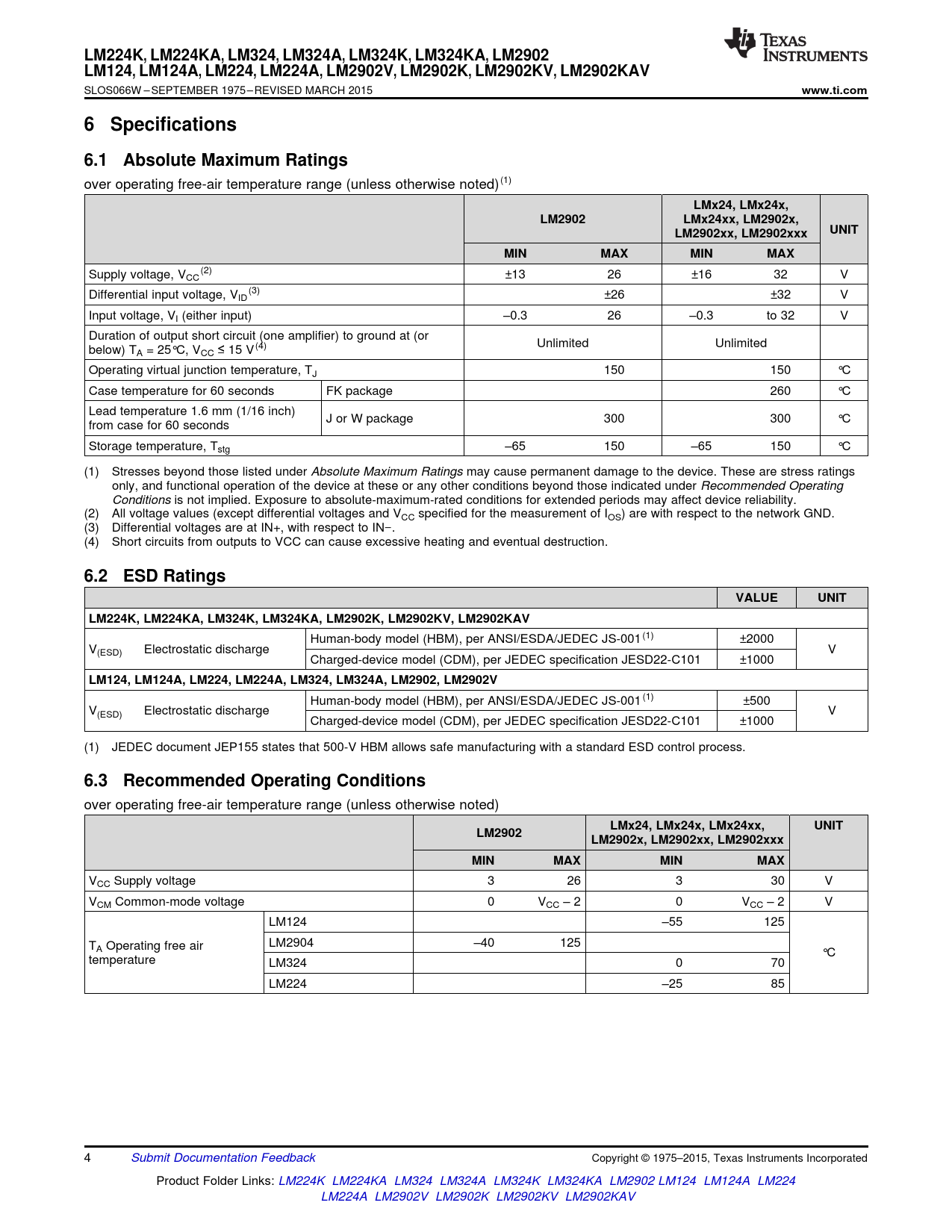 6.2 ESD Ratings VALUE UNIT LM224K, LM224KA, LM324K, LM324KA, LM2902K, LM2902KV, LM2902KAV