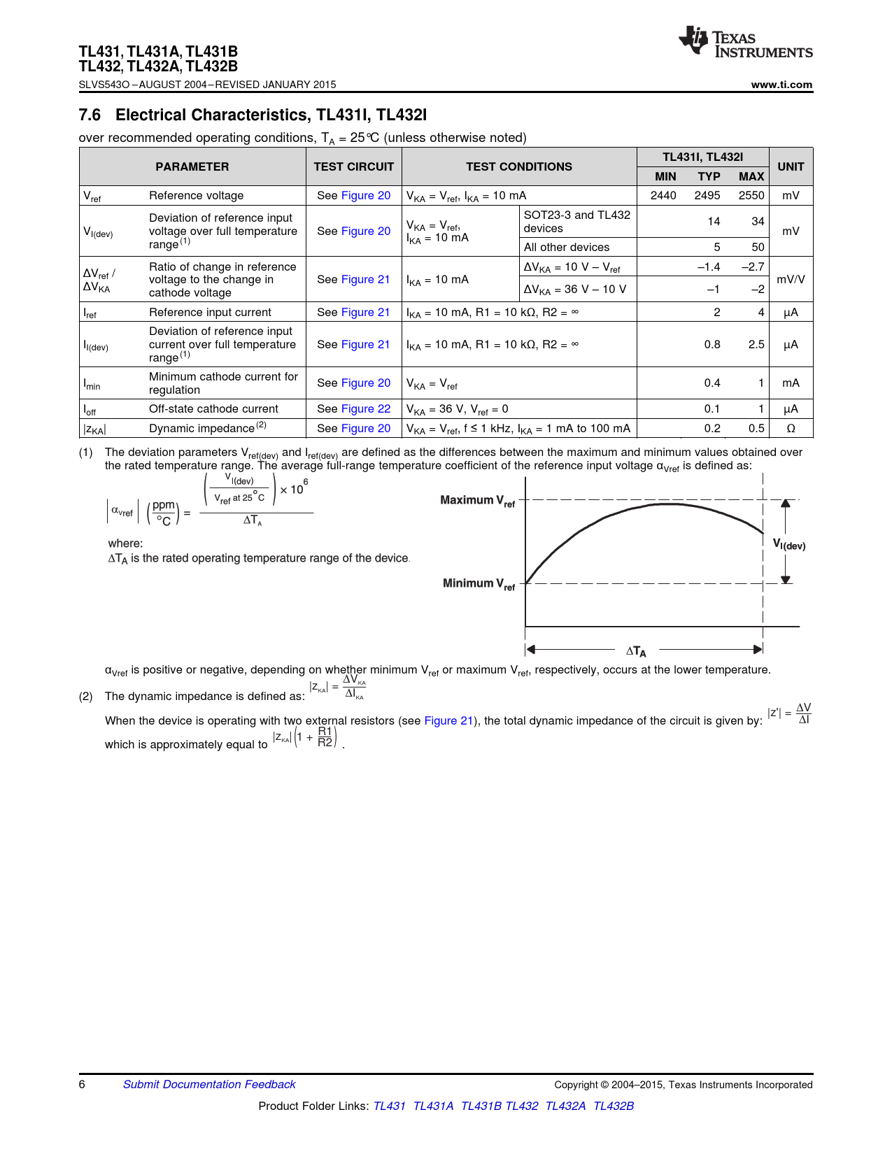 www.ti.com 7.6 Electrical Characteristics, TL431I, TL432I