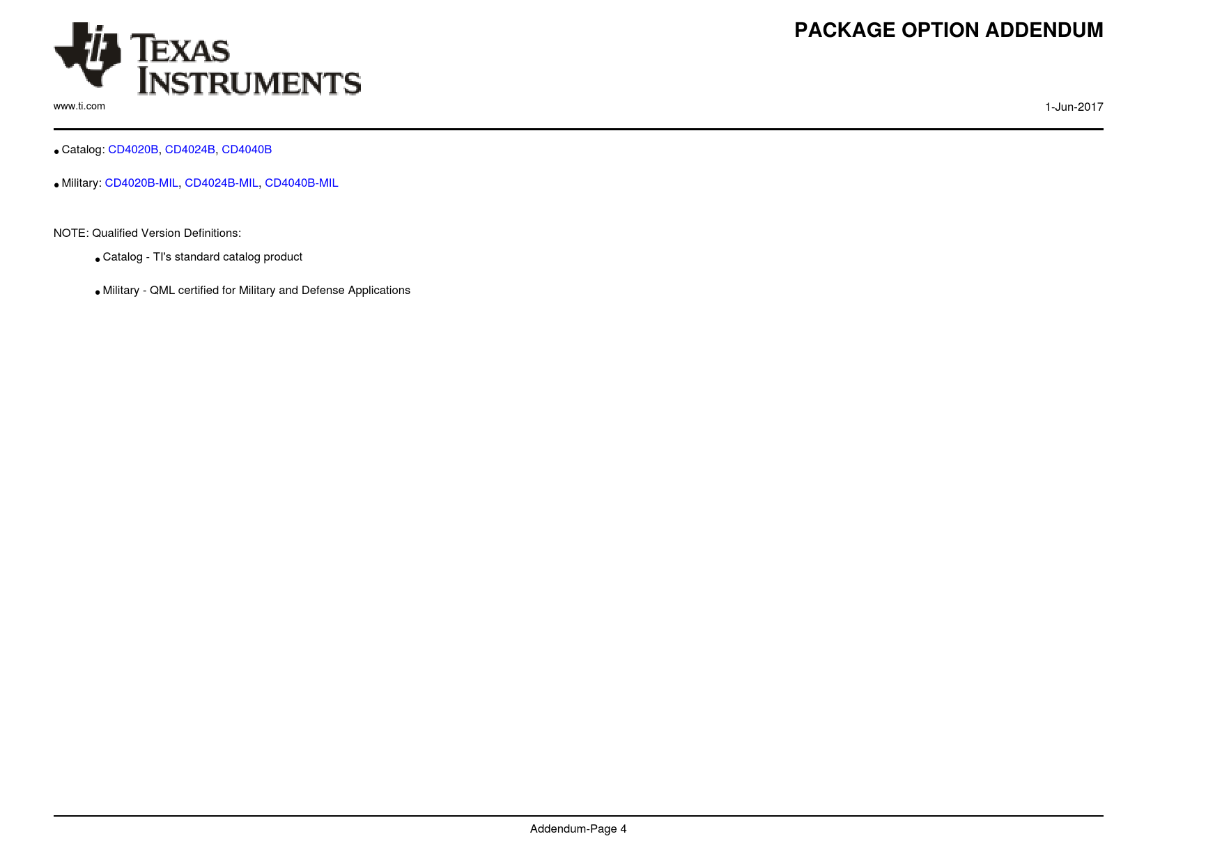 www.ti.com 1-Jun-2017 • Catalog: CD4020B, CD4024B, CD4040B • Military: CD4020B-MIL, CD4024B-MIL, CD4040B-MIL NOTE: Qualified Version Definitions: • Catalog - TI's standard catalog product • Military - QML certified for Military and Defense Applications Addendum-Page 4