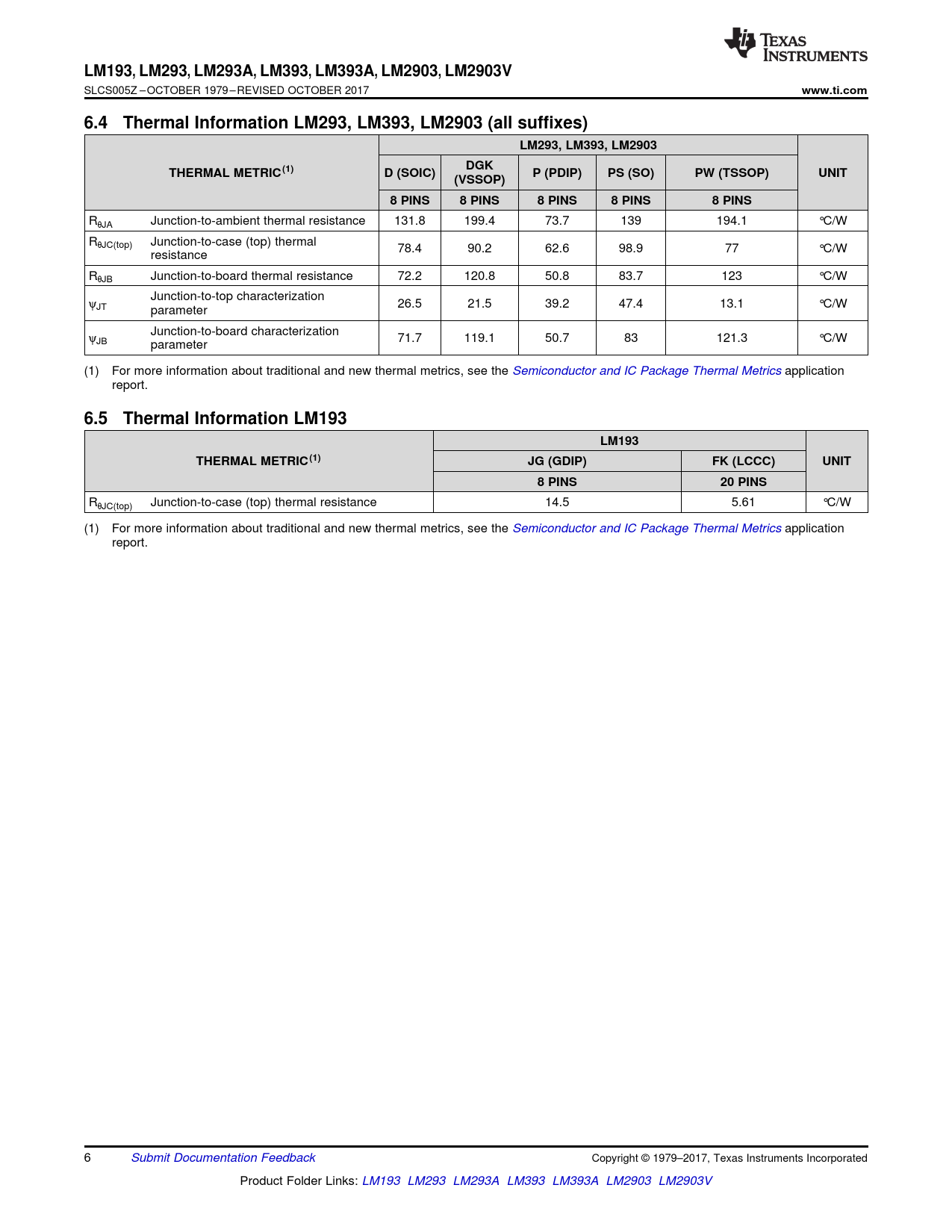 LM193,. LM293,. LM293A. , LM393. , LM393A. , LM2903,. LM2903V. www.ti.com. 6.4 Thermal Information LM293, LM393, LM2903 (all suffixes)