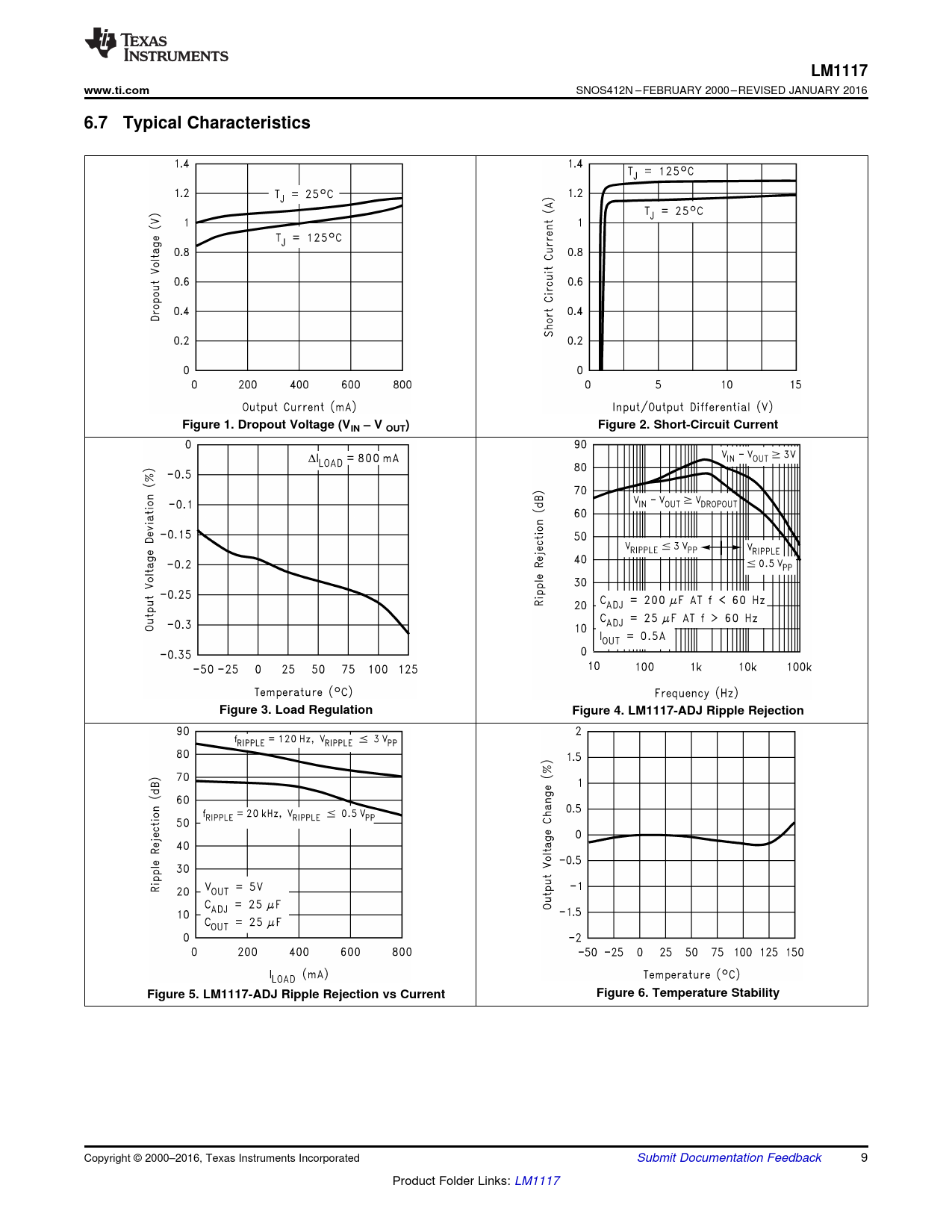 6.7 Typical Characteristics Figure 1. Dropout Voltage (VIN – V OUT) Figure 2. Short-Circuit Current Figure 3. Load Regulation Figure 4. LM1117-ADJ Ripple Rejection Figure 5. LM1117-ADJ Ripple Rejection vs Current Figure 6. Temperature Stability
