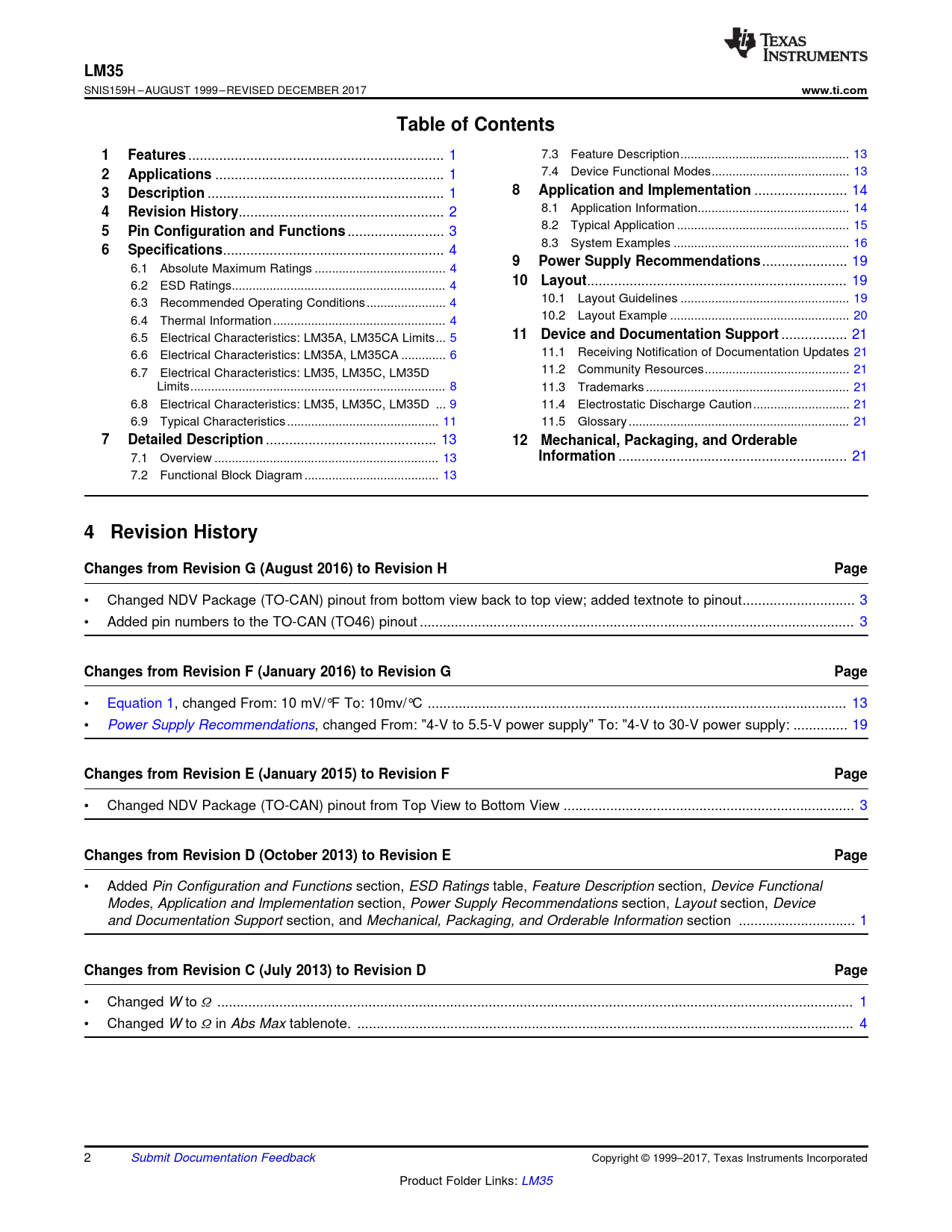4 Revision History Changes from Revision G (August 2016) to Revision H Page