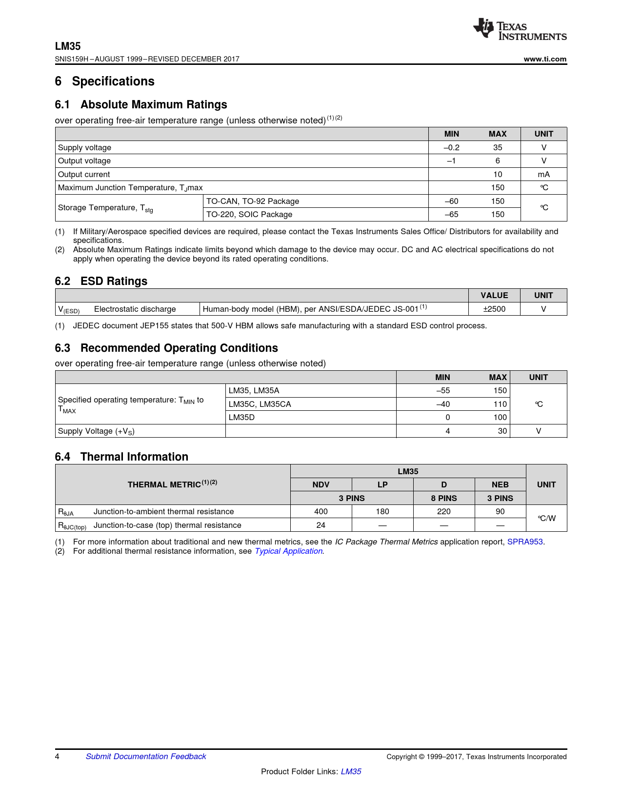 LM35. www.ti.com. 6 Specifications. 6.1 Absolute Maximum Ratings. MIN. MAX. UNIT. 6.2 ESD Ratings. VALUE