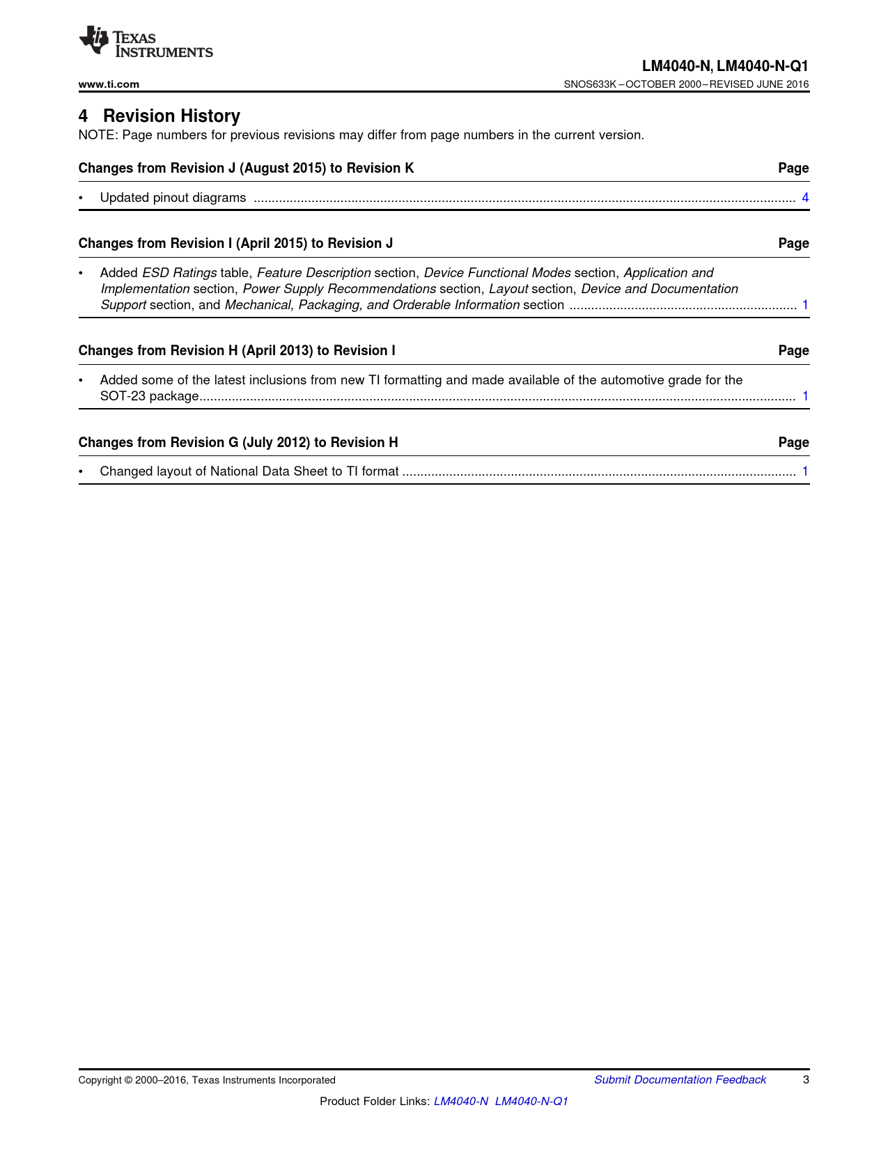 LM4040-N,. LM4040-N-Q1. www.ti.com. 4 Revision History. Changes from Revision J (August 2015) to Revision K. Page