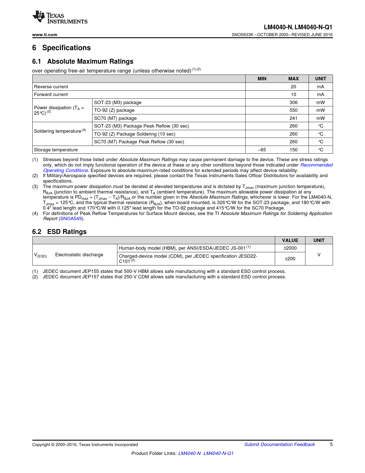 LM4040-N,. LM4040-N-Q1. www.ti.com. 6 Specifications. 6.1 Absolute Maximum Ratings. MIN. MAX. UNIT. 6.2 ESD Ratings. VALUE