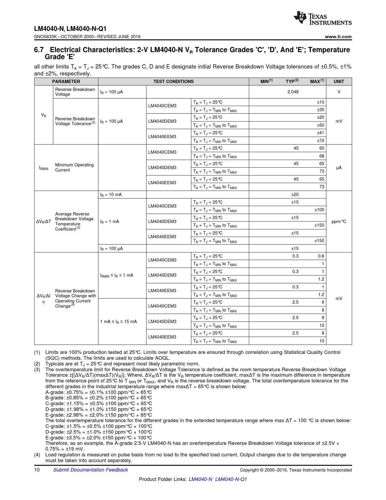 www.ti.com 6.7 Electrical Characteristics: 2-V LM4040-N VR Tolerance Grades 'C', 'D', And 'E'; Temperature Grade 'E'