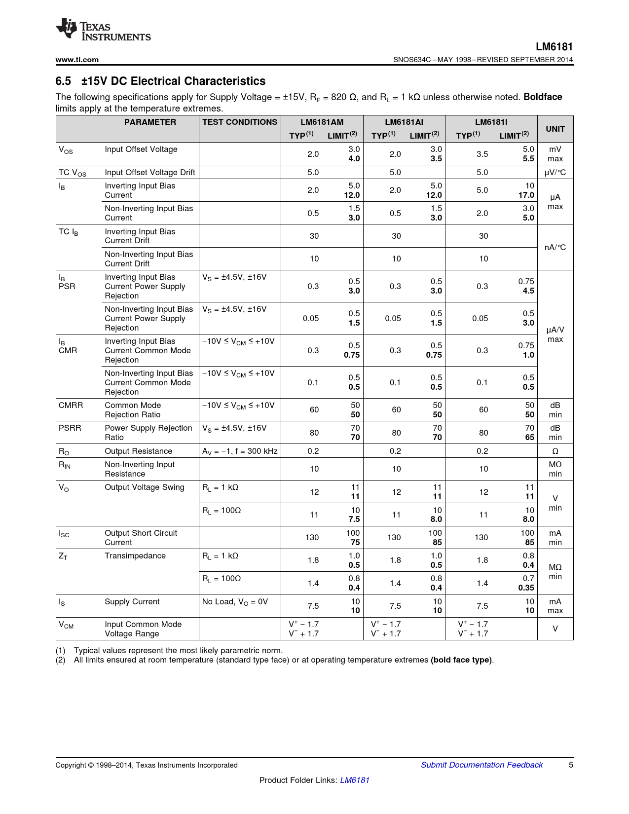 | 页数 / 页 | 39 / 5 — LM6181. www.ti.com. 6.5 ±15V DC Electrical Characteristics. Boldface. … |