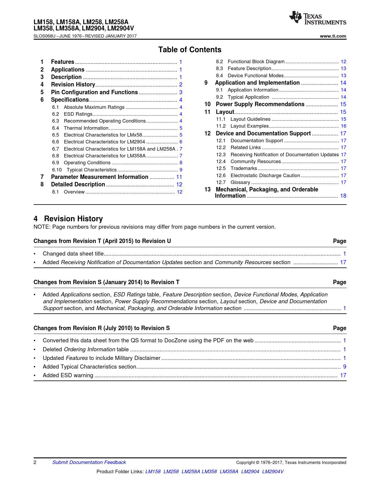 LM158,. LM158A, LM258. , LM258A. LM358,. LM358A. , LM2904,. LM2904V. www.ti.com. Table of Contents. Features. Applications. Description