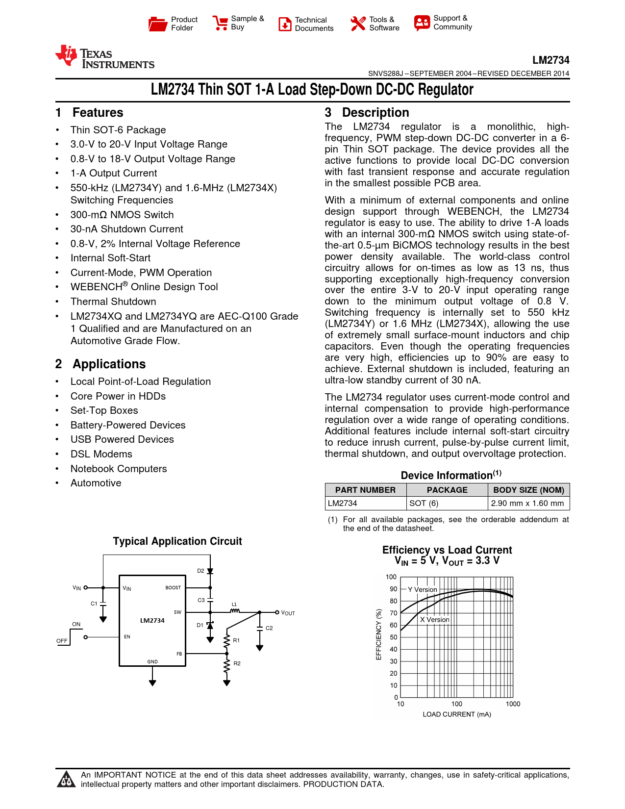 LM2734. LM2734 Thin SOT 1-A Load Step-Down DC-DC Regulator. 1 Features. 3 Description. 2 Applications. Device Information(1)