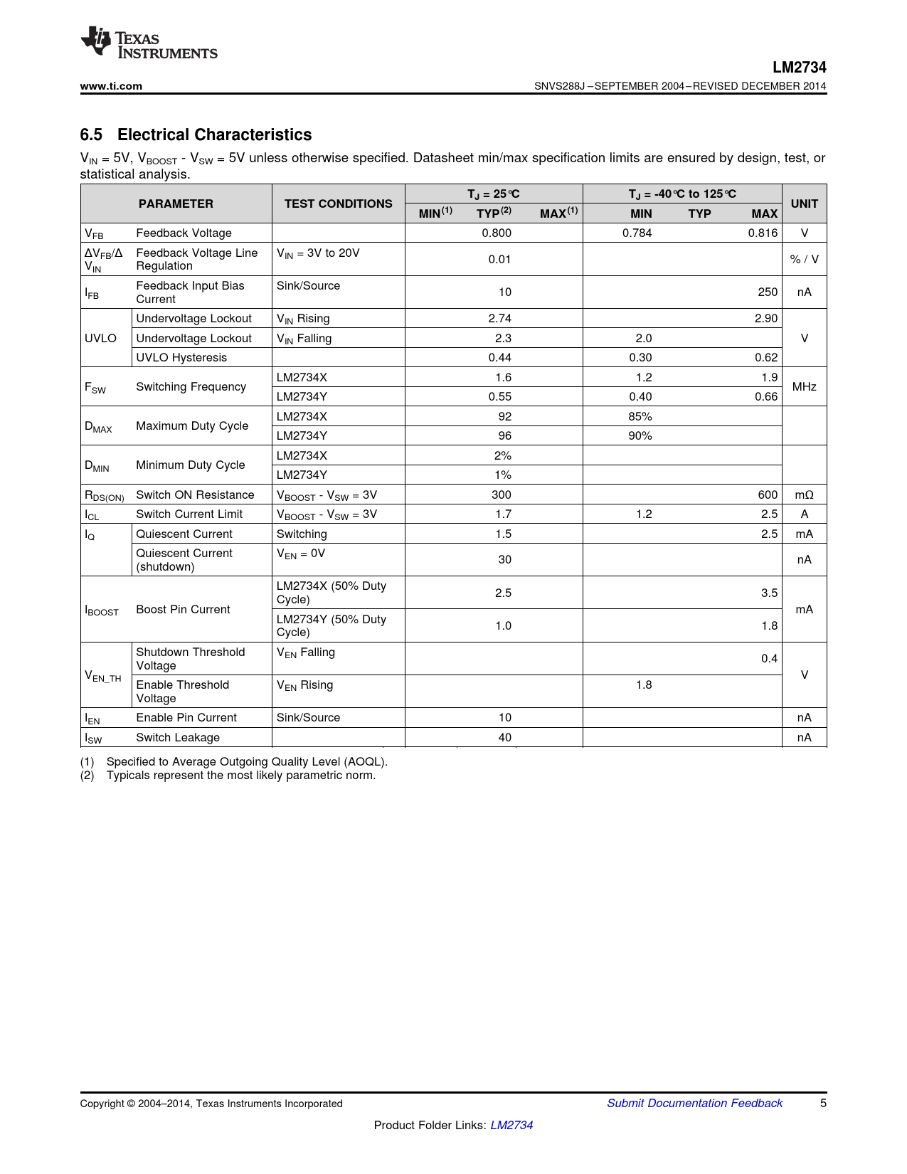| 页数 / 页 | 37 / 5 — LM2734. www.ti.com. 6.5 Electrical Characteristics. TJ = 25°C. TJ = -40°C … |