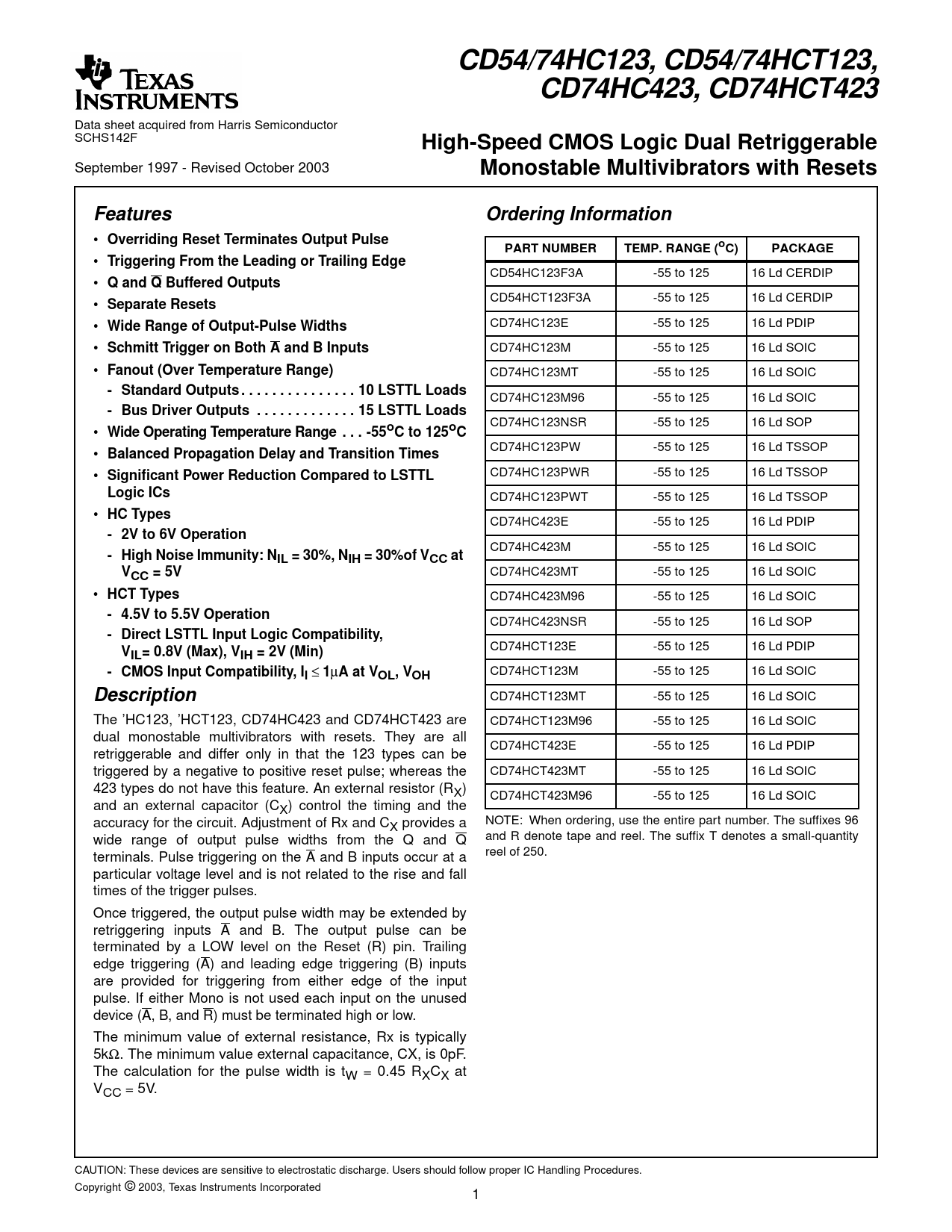 Datasheet CD54HC123, CD74HC123, CD54HCT123, CD74HCT123, CD74HC423, CD74HCT423 (Texas Instruments)