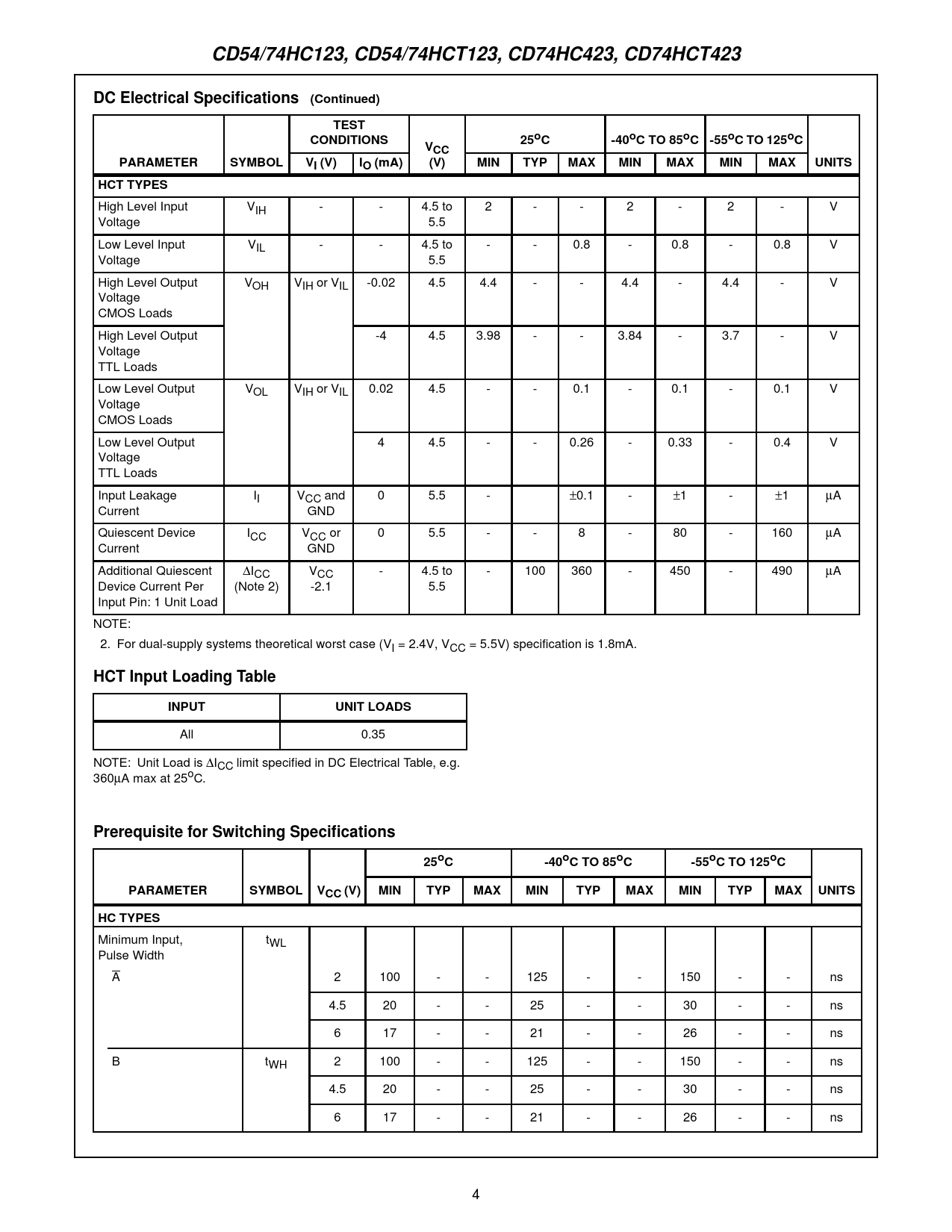 CD54/74HC123, CD54/74HCT123, CD74HC423, CD74HCT423. DC Electrical Specifications (Continued). TEST. CONDITIONS. 25oC