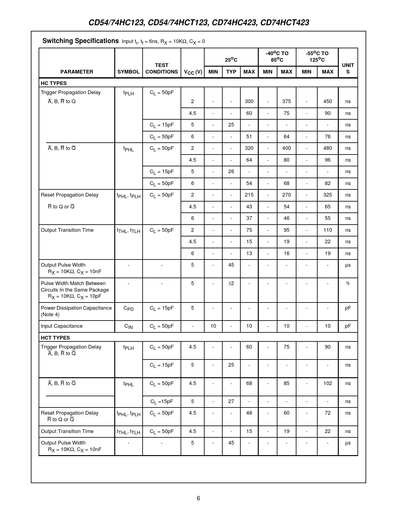 CD54/74HC123, CD54/74HCT123, CD74HC423, CD74HCT423. Switching Specifications. -40oC TO. -55oC TO. 25oC. 85oC. 125oC. TEST. UNIT