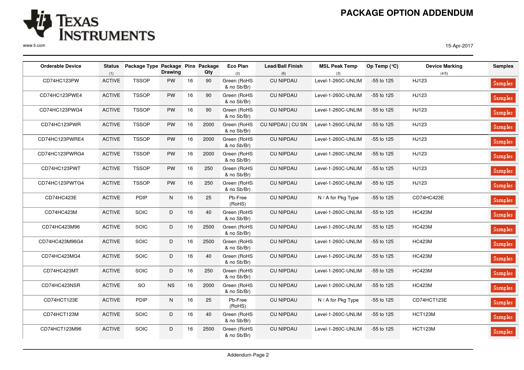 PACKAGE OPTION ADDENDUM www.ti.com 15-Apr-2017 Orderable DeviceStatusPackage Type Package Pins PackageEco PlanLead/Ball FinishMSL Peak TempOp Temp (°C)Device MarkingSamples (1) DrawingQty (2) (6) (3) (4/5) CD74HC123PW ACTIVE TSSOP PW 16 90 Green (RoHS CU NIPDAU Level-1-260C-UNLIM -55 to 125 HJ123 & no Sb/Br) CD74HC123PWE4 ACTIVE TSSOP PW 16 90 Green (RoHS CU NIPDAU Level-1-260C-UNLIM -55 to 125 HJ123 & no Sb/Br) CD74HC123PWG4 ACTIVE TSSOP PW 16 90 Green (RoHS CU NIPDAU Level-1-260C-UNLIM -55 to 125 HJ123 & no Sb/Br) CD74HC123PWR ACTIVE TSSOP PW 16 2000 Green (RoHS CU NIPDAU | CU SN Level-1-260C-UNLIM -55 to 125 HJ123 & no Sb/Br) CD74HC123PWRE4 ACTIVE TSSOP PW 16 2000 Green (RoHS CU NIPDAU Level-1-260C-UNLIM -55 to 125 HJ123 & no Sb/Br) CD74HC123PWRG4 ACTIVE TSSOP PW 16 2000 Green (RoHS CU NIPDAU Level-1-260C-UNLIM -55 to 125 HJ123 & no Sb/Br) CD74HC123PWT ACTIVE TSSOP PW 16 250 Green (RoHS CU NIPDAU Level-1-260C-UNLIM -55 to 125 HJ123 & no Sb/Br) CD74HC123PWTG4 ACTIVE TSSOP PW 16 250 Green (RoHS CU NIPDAU Level-1-260C-UNLIM -55 to 125 HJ123 & no Sb/Br) CD74HC423E ACTIVE PDIP N 16 25 Pb-Free CU NIPDAU N / A for Pkg Type -55 to 125 CD74HC423E (RoHS) CD74HC423M ACTIVE SOIC D 16 40 Green (RoHS CU NIPDAU Level-1-260C-UNLIM -55 to 125 HC423M & no Sb/Br) CD74HC423M96 ACTIVE SOIC D 16 2500 Green (RoHS CU NIPDAU Level-1-260C-UNLIM -55 to 125 HC423M & no Sb/Br) CD74HC423M96G4 ACTIVE SOIC D 16 2500 Green (RoHS CU NIPDAU Level-1-260C-UNLIM -55 to 125 HC423M & no Sb/Br) CD74HC423MG4 ACTIVE SOIC D 16 40 Green (RoHS CU NIPDAU Level-1-260C-UNLIM -55 to 125 HC423M & no Sb/Br) CD74HC423MT ACTIVE SOIC D 16 250 Green (RoHS CU NIPDAU Level-1-260C-UNLIM -55 to 125 HC423M & no Sb/Br) CD74HC423NSR ACTIVE SO NS 16 2000 Green (RoHS CU NIPDAU Level-1-260C-UNLIM -55 to 125 HC423M & no Sb/Br) CD74HCT123E ACTIVE PDIP N 16 25 Pb-Free CU NIPDAU N / A for Pkg Type -55 to 125 CD74HCT123E (RoHS) CD74HCT123M ACTIVE SOIC D 16 40 Green (RoHS CU NIPDAU Level-1-260C-UNLIM -55 to 125 HCT123M & no Sb/Br) CD74HCT123M96 ACTIVE SOIC D 16 2500 Green (RoHS CU NIPDAU Level-1-260C-UNLIM -55 to 125 HCT123M & no Sb/Br) Addendum-Page 2