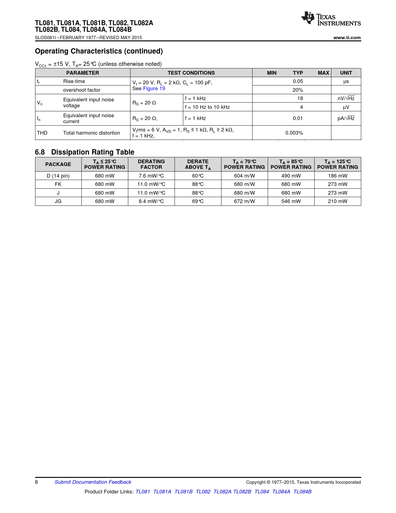 TL081. , TL081A,. TL081B. , TL082,. TL082A. TL082B. , TL084,. TL084A. , TL084B. www.ti.com. Operating Characteristics (continued). PARAMETER