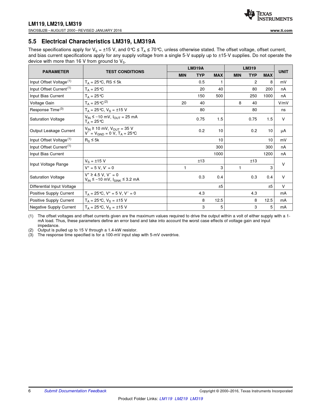 LM119,. LM219,. LM319. www.ti.com. 5.5 Electrical Characteristics LM319, LM319A. LM319A. PARAMETER. TEST CONDITIONS. UNIT. MIN. TYP. MAX