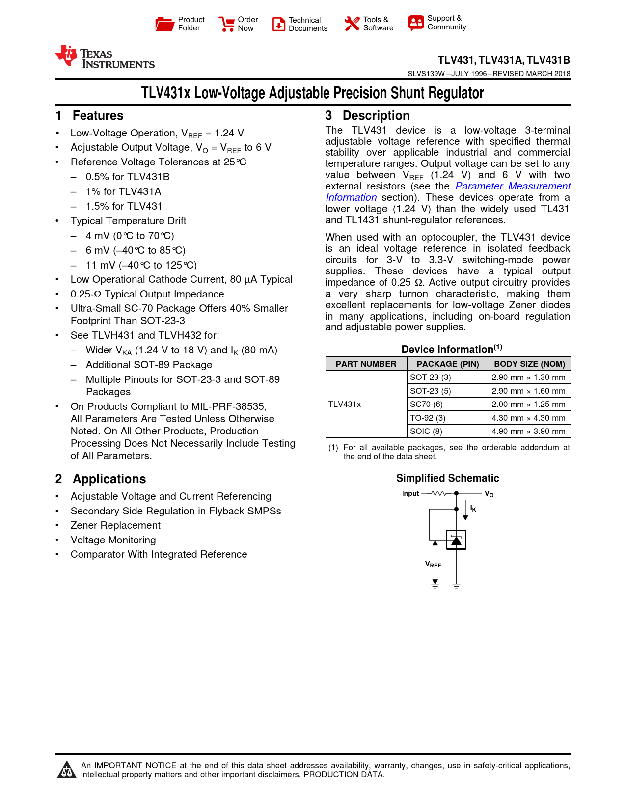 link to page 25 link to page 25 link to page 25 link to page 25 link to page 25 link to page 16 link to page 16 link to page 1 Product Order Technical Tools & Support & Folder Now Documents Software Community TLV431, TLV431A,TLV431B SLVS139W – JULY 1996 – REVISED MARCH 2018 TLV431x Low-Voltage Adjustable Precision Shunt Regulator1 Features3 Description • Low-Voltage Operation, V The TLV431 device is a low-voltage 3-terminal 1 REF = 1.24 V adjustable voltage reference with specified thermal • Adjustable Output Voltage, VO = VREF to 6 V stability over applicable industrial and commercial • Reference Voltage Tolerances at 25°C temperature ranges. Output voltage can be set to any – 0.5% for TLV431B value between VREF (1.24 V) and 6 V with two external resistors (see the Parameter Measurement – 1% for TLV431A Information section). These devices operate from a – 1.5% for TLV431 lower voltage (1.24 V) than the widely used TL431 • Typical Temperature Drift and TL1431 shunt-regulator references. – 4 mV (0°C to 70°C) When used with an optocoupler, the TLV431 device – 6 mV (–40°C to 85°C) is an ideal voltage reference in isolated feedback circuits for 3-V to 3.3-V switching-mode power – 11 mV (–40°C to 125°C) supplies. These devices have a typical output • Low Operational Cathode Current, 80 µA Typical impedance of 0.25 Ω. Active output circuitry provides • 0.25-Ω Typical Output Impedance a very sharp turnon characteristic, making them • Ultra-Small SC-70 Package Offers 40% Smaller excellent replacements for low-voltage Zener diodes in many applications, including on-board regulation Footprint Than SOT-23-3 and adjustable power supplies. • See TLVH431 and TLVH432 for: – Wider VKA (1.24 V to 18 V) and IK (80 mA) Device Information(1) – Additional SOT-89 Package PART NUMBERPACKAGE (PIN)BODY SIZE (NOM) – Multiple Pinouts for SOT-23-3 and SOT-89 SOT-23 (3) 2.90 mm × 1.30 mm Packages SOT-23 (5) 2.90 mm × 1.60 mm • On Products Compliant to MIL-PRF-38535, TLV431x SC70 (6) 2.00 mm × 1.25 mm All Parameters Are Tested Unless Otherwise TO-92 (3) 4.30 mm × 4.30 mm Noted. On All Other Products, Production SOIC (8) 4.90 mm × 3.90 mm Processing Does Not Necessarily Include Testing (1) For all available packages, see the orderable addendum at of All Parameters. the end of the data sheet. 2 ApplicationsSimplified SchematicInputVO • Adjustable Voltage and Current Referencing IK • Secondary Side Regulation in Flyback SMPSs • Zener Replacement • Voltage Monitoring • Comparator With Integrated Reference VREF 1 An IMPORTANT NOTICE at the end of this data sheet addresses availability, warranty, changes, use in safety-critical applications, intellectual property matters and other important disclaimers. PRODUCTION DATA. Document Outline 1 Features 2 Applications 3 Description Table of Contents 4 Revision History 5 Pin Configuration and Functions 6 Specifications 6.1 Absolute Maximum Ratings 6.2 ESD Ratings 6.3 Recommended Operating Conditions 6.4 Thermal Information 6.5 Electrical Characteristics for TLV431 6.6 Electrical Characteristics for TLV431A 6.7 Electrical Characteristics for TLV431B 6.8 Typical Characteristics 7 Parameter Measurement Information 8 Detailed Description 8.1 Overview 8.2 Functional Block Diagram 8.3 Feature Description 8.4 Device Functional Modes 8.4.1 Open Loop (Comparator) 8.4.2 Closed Loop 9 Applications and Implementation 9.1 Application Information 9.2 Typical Applications 9.2.1 Comparator With Integrated Reference (Open Loop) 9.2.1.1 Design Requirements 9.2.1.2 Detailed Design Procedure 9.2.1.3 Application Curves 9.2.2 Shunt Regulator/Reference 9.2.2.1 Design Requirements 9.2.2.2 Detailed Design Procedure 9.2.2.3 Application Curve 10 Power Supply Recommendations 11 Layout 11.1 Layout Guidelines 11.2 Layout Example 12 Device and Documentation Support 12.1 Documentation Support 12.1.1 Related Documentation 12.2 Related Links 12.3 Receiving Notification of Documentation Updates 12.4 Community Resources 12.5 Trademarks 12.6 Electrostatic Discharge Caution 12.7 Glossary 13 Mechanical, Packaging, and Orderable Information