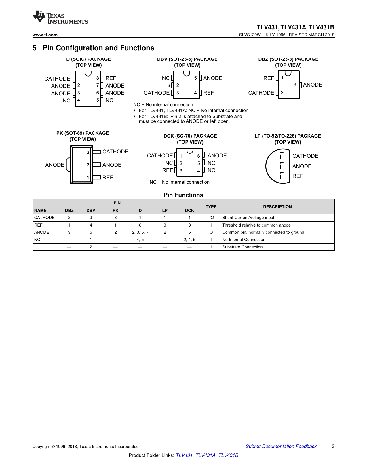 CATHODE 1 8 REF NC 1 5 ANODE REF 1 ANODE 2 7 ANODE 2 ∗ 3 ANODE ANODE 3 6 ANODE CATHODE 3 4 REF CATHODE 2 4 5 NC NC NC − No internal connection ∗ For TLV431, TLV431A: NC − No internal connection ∗ For TLV431B: Pin 2 is attached to Substrate and must be connected to ANODE or left open.