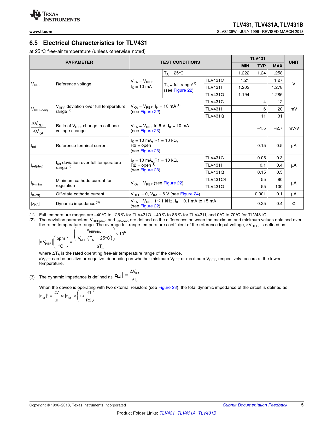 TLV431. , TLV431A,. TLV431B. www.ti.com. 6.5 Electrical Characteristics for TLV431. PARAMETER. TEST CONDITIONS. UNIT. MIN. TYP. MAX