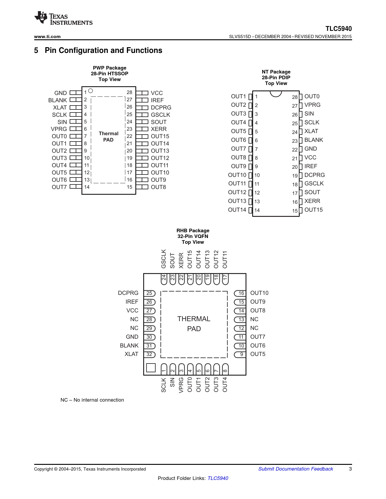 TLC5940. www.ti.com. 5 Pin Configuration and Functions. PWP Package. NT Package. 28-Pin HTSSOP. 28-Pin PDIP. Top View. Thermal. PAD