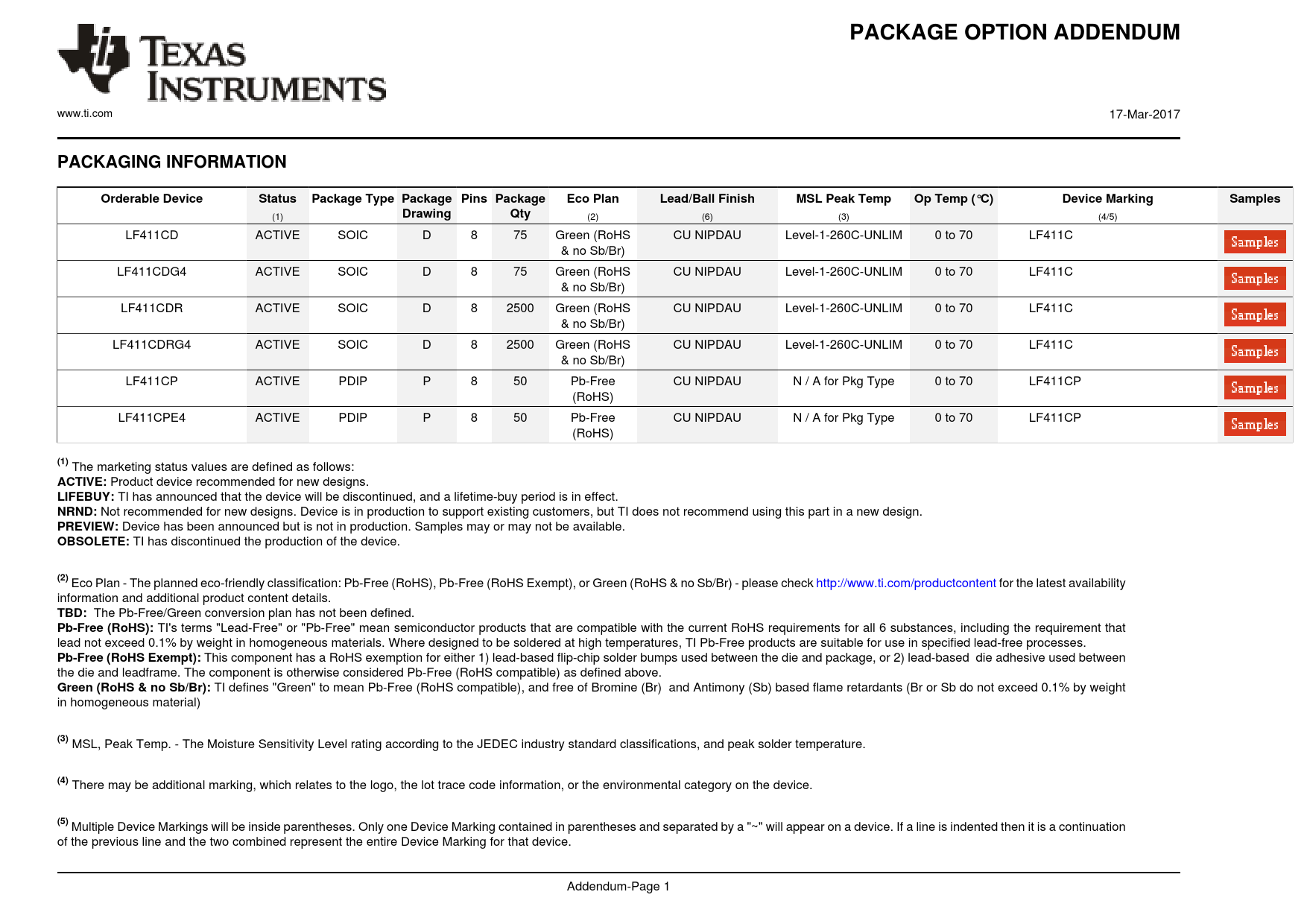 PACKAGE OPTION ADDENDUM www.ti.com 17-Mar-2017 PACKAGING INFORMATIONOrderable DeviceStatusPackage Type Package Pins PackageEco PlanLead/Ball FinishMSL Peak TempOp Temp (°C)Device MarkingSamples (1) DrawingQty (2) (6) (3) (4/5) LF411CD ACTIVE SOIC D 8 75 Green (RoHS CU NIPDAU Level-1-260C-UNLIM 0 to 70 LF411C & no Sb/Br) LF411CDG4 ACTIVE SOIC D 8 75 Green (RoHS CU NIPDAU Level-1-260C-UNLIM 0 to 70 LF411C & no Sb/Br) LF411CDR ACTIVE SOIC D 8 2500 Green (RoHS CU NIPDAU Level-1-260C-UNLIM 0 to 70 LF411C & no Sb/Br) LF411CDRG4 ACTIVE SOIC D 8 2500 Green (RoHS CU NIPDAU Level-1-260C-UNLIM 0 to 70 LF411C & no Sb/Br) LF411CP ACTIVE PDIP P 8 50 Pb-Free CU NIPDAU N / A for Pkg Type 0 to 70 LF411CP (RoHS) LF411CPE4 ACTIVE PDIP P 8 50 Pb-Free CU NIPDAU N / A for Pkg Type 0 to 70 LF411CP (RoHS) (1) The marketing status values are defined as follows: ACTIVE: Product device recommended for new designs. LIFEBUY: TI has announced that the device will be discontinued, and a lifetime-buy period is in effect. NRND: Not recommended for new designs. Device is in production to support existing customers, but TI does not recommend using this part in a new design. PREVIEW: Device has been announced but is not in production. Samples may or may not be available. OBSOLETE: TI has discontinued the production of the device. (2) Eco Plan - The planned eco-friendly classification: Pb-Free (RoHS), Pb-Free (RoHS Exempt), or Green (RoHS & no Sb/Br) - please check http://www.ti.com/productcontent for the latest availability information and additional product content details. TBD: The Pb-Free/Green conversion plan has not been defined. Pb-Free (RoHS): TI's terms "Lead-Free" or "Pb-Free" mean semiconductor products that are compatible with the current RoHS requirements for all 6 substances, including the requirement that lead not exceed 0.1% by weight in homogeneous materials. Where designed to be soldered at high temperatures, TI Pb-Free products are suitable for use in specified lead-free processes. Pb-Free (RoHS Exempt): This component has a RoHS exemption for either 1) lead-based flip-chip solder bumps used between the die and package, or 2) lead-based die adhesive used between the die and leadframe. The component is otherwise considered Pb-Free (RoHS compatible) as defined above. Green (RoHS & no Sb/Br): TI defines "Green" to mean Pb-Free (RoHS compatible), and free of Bromine (Br) and Antimony (Sb) based flame retardants (Br or Sb do not exceed 0.1% by weight in homogeneous material) (3) MSL, Peak Temp. - The Moisture Sensitivity Level rating according to the JEDEC industry standard classifications, and peak solder temperature. (4) There may be additional marking, which relates to the logo, the lot trace code information, or the environmental category on the device. (5) Multiple Device Markings will be inside parentheses. Only one Device Marking contained in parentheses and separated by a "~" will appear on a device. If a line is indented then it is a continuation of the previous line and the two combined represent the entire Device Marking for that device. Addendum-Page 1