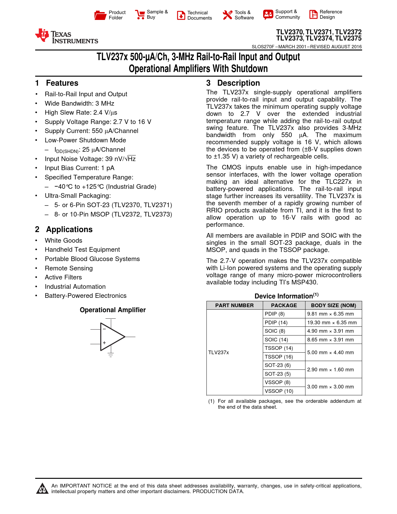 TLV2370,. TLV2371. , TLV2372. TLV2373,. TLV2374. , TLV2375. TLV237x 500-µA/Ch, 3-MHz Rail-to-Rail Input and Output