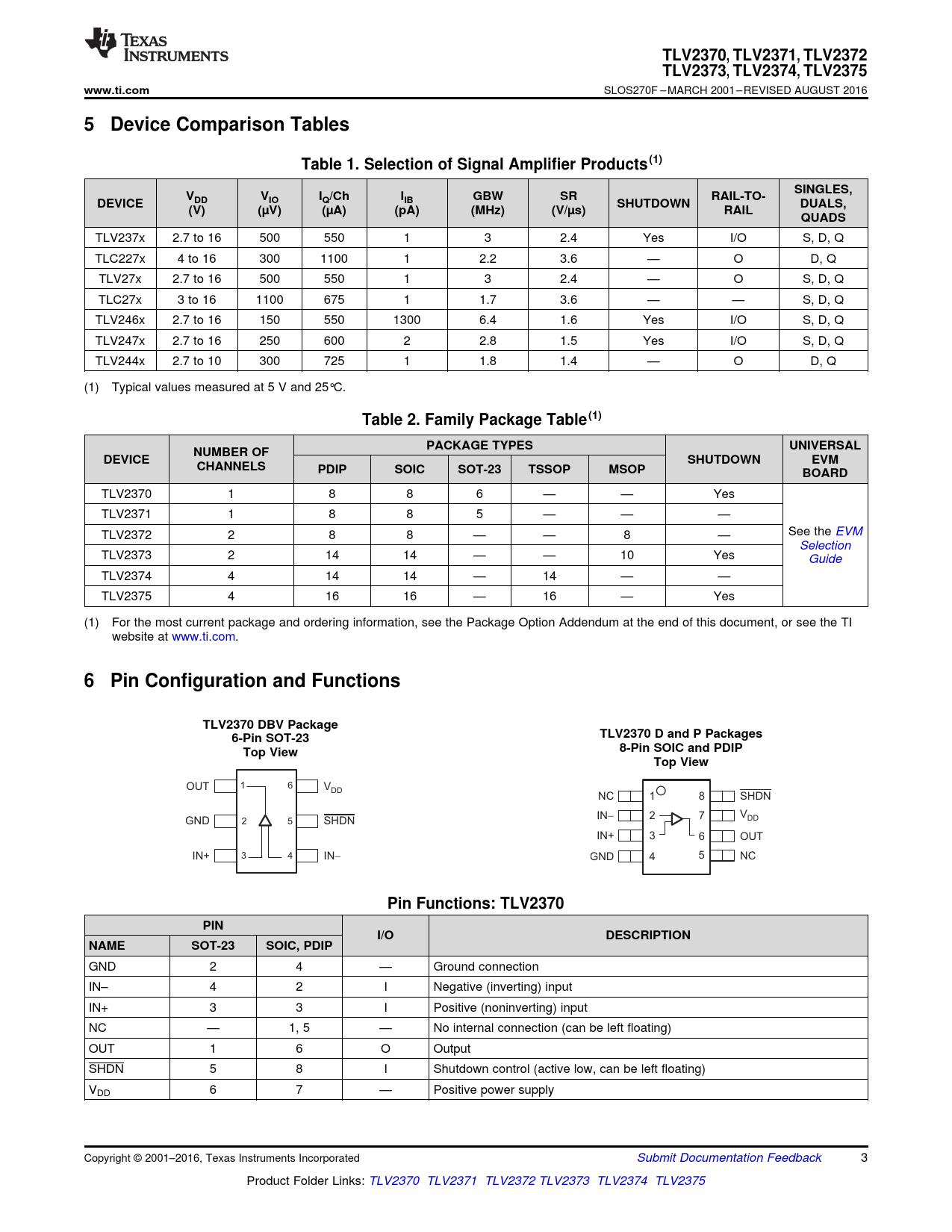 TLV2370,. TLV2371. , TLV2372. TLV2373,. TLV2374. , TLV2375. www.ti.com. 5 Device Comparison Tables