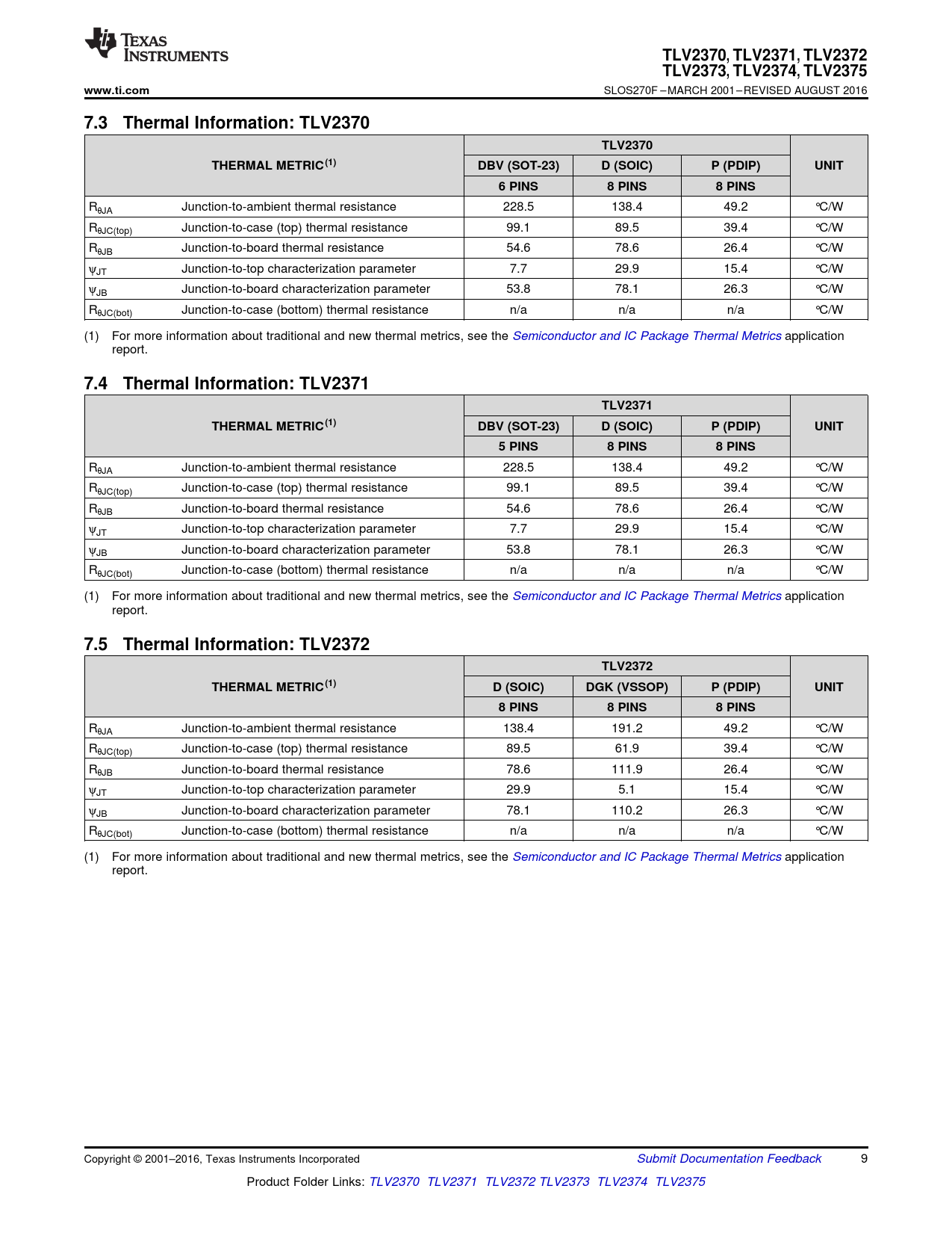 TLV2370,. TLV2371. , TLV2372. TLV2373,. TLV2374. , TLV2375. www.ti.com. 7.3 Thermal Information: TLV2370. TLV2370. THERMAL METRIC(1)