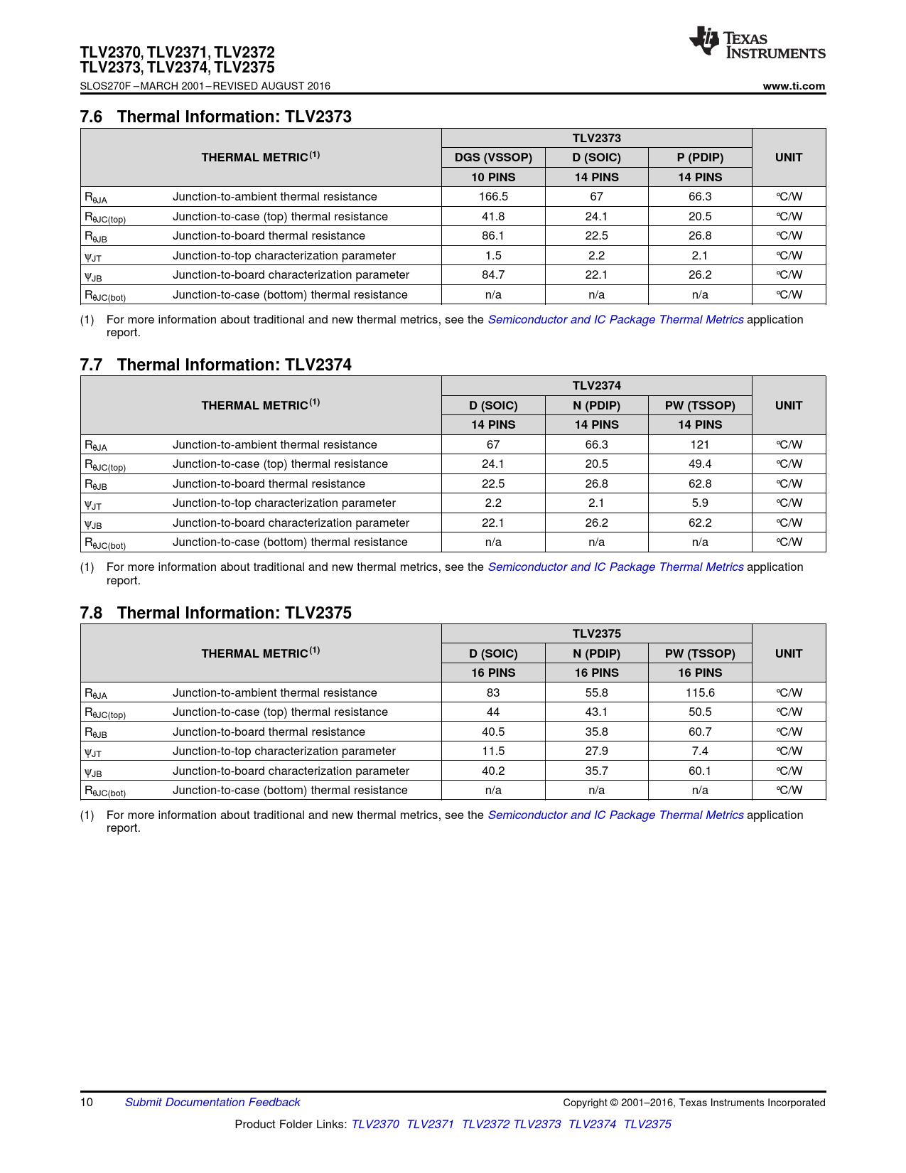 TLV2370,. TLV2371,. TLV2372. TLV2373,. TLV2374,. TLV2375. www.ti.com. 7.6 Thermal Information: TLV2373. TLV2373. THERMAL METRIC(1)