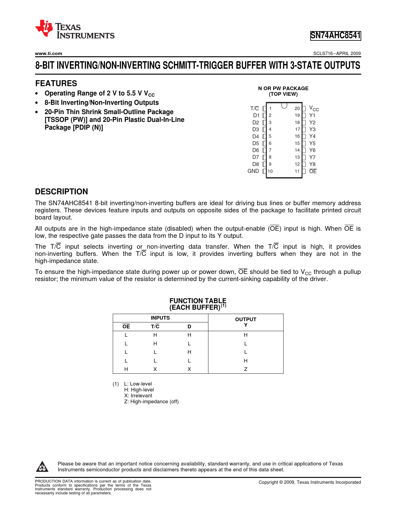 SN74AHC8541. www.ti.com. 8-BIT INVERTING/NON-INVERTING SCHMITT-TRIGGER BUFFER WITH 3-STATE OUTPUTS. FEATURES. N OR PW PACKAGE