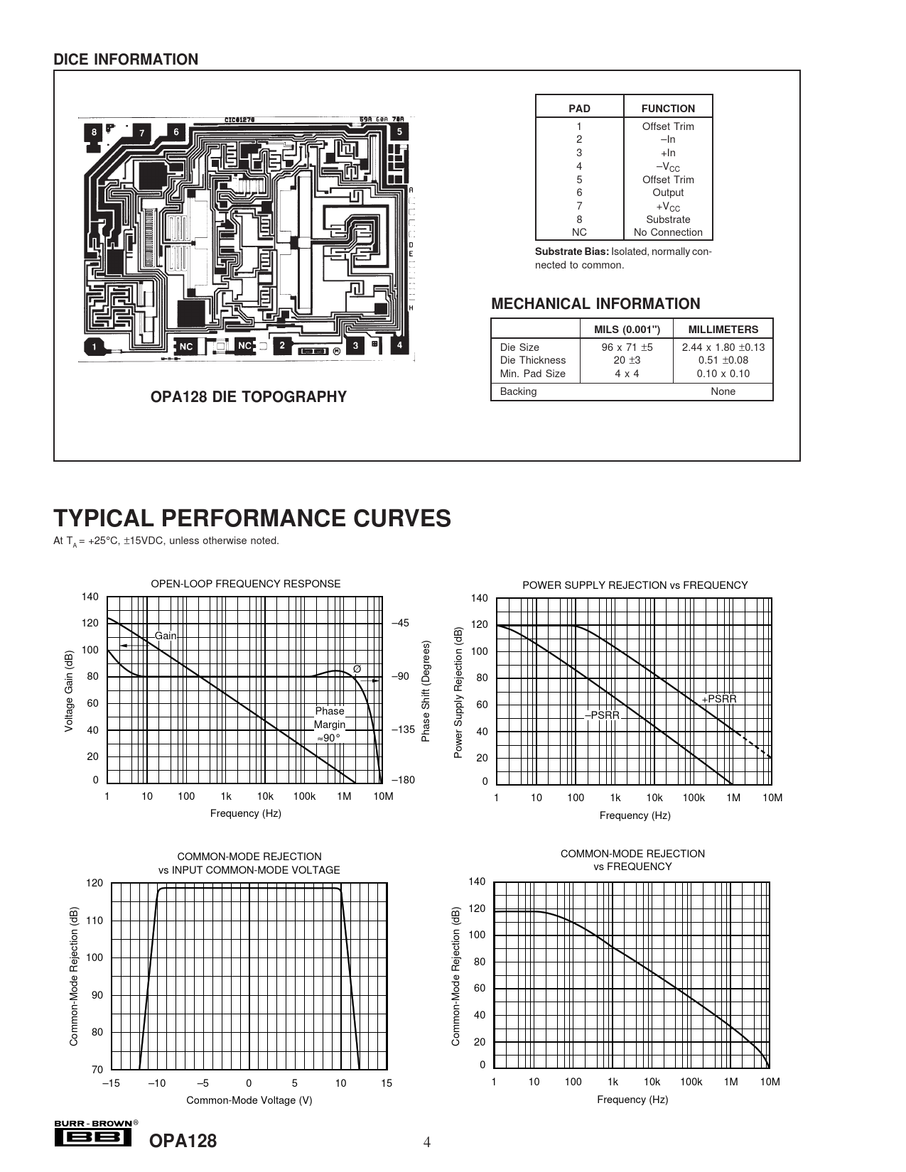 DICE INFORMATION. PAD. FUNCTION. Substrate Bias:. MECHANICAL INFORMATION. MILS (0.001"). MILLIMETERS. OPA128 DIE TOPOGRAPHY
