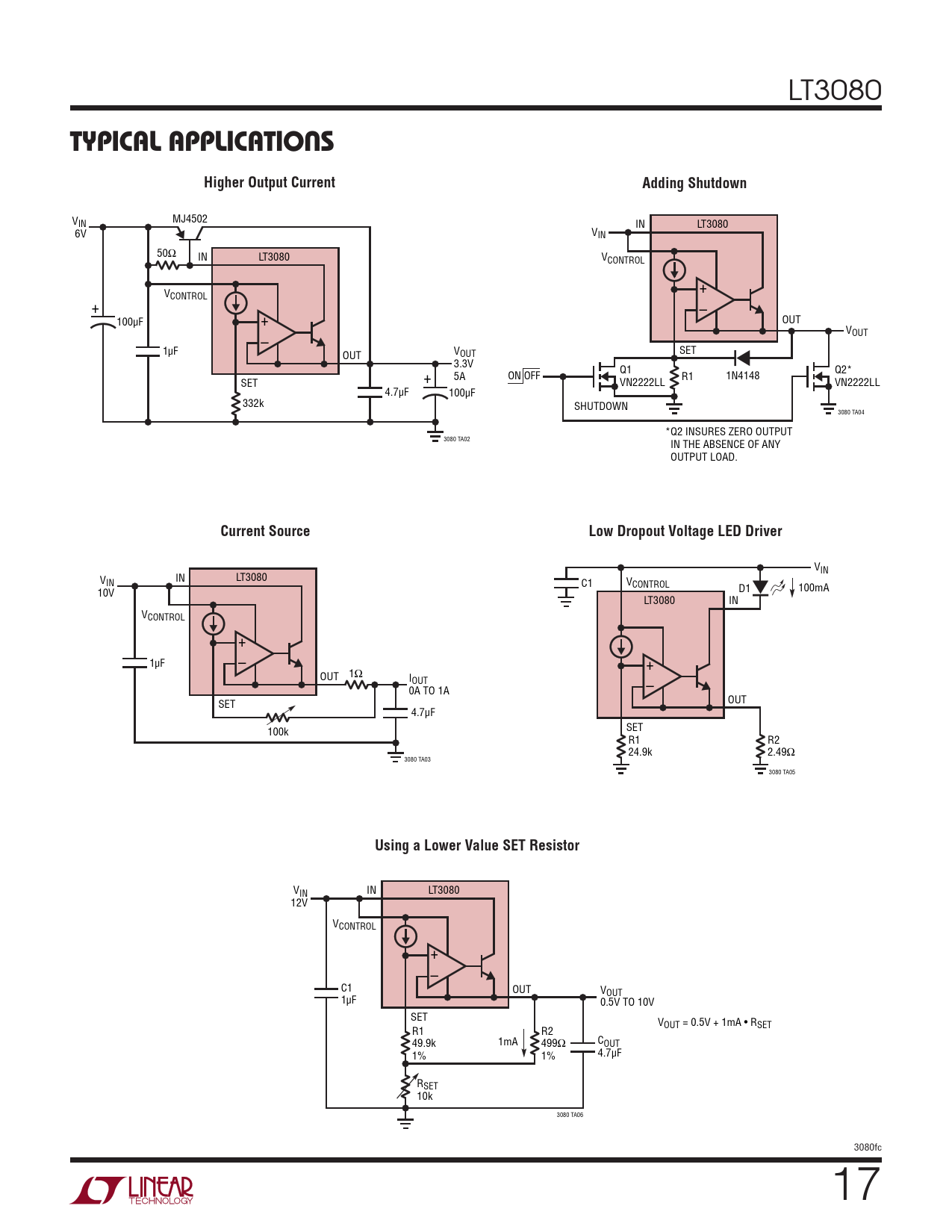 Typical applicaTions. Higher Output Current. Adding Shutdown. Current Source. Low Dropout Voltage LED Driver