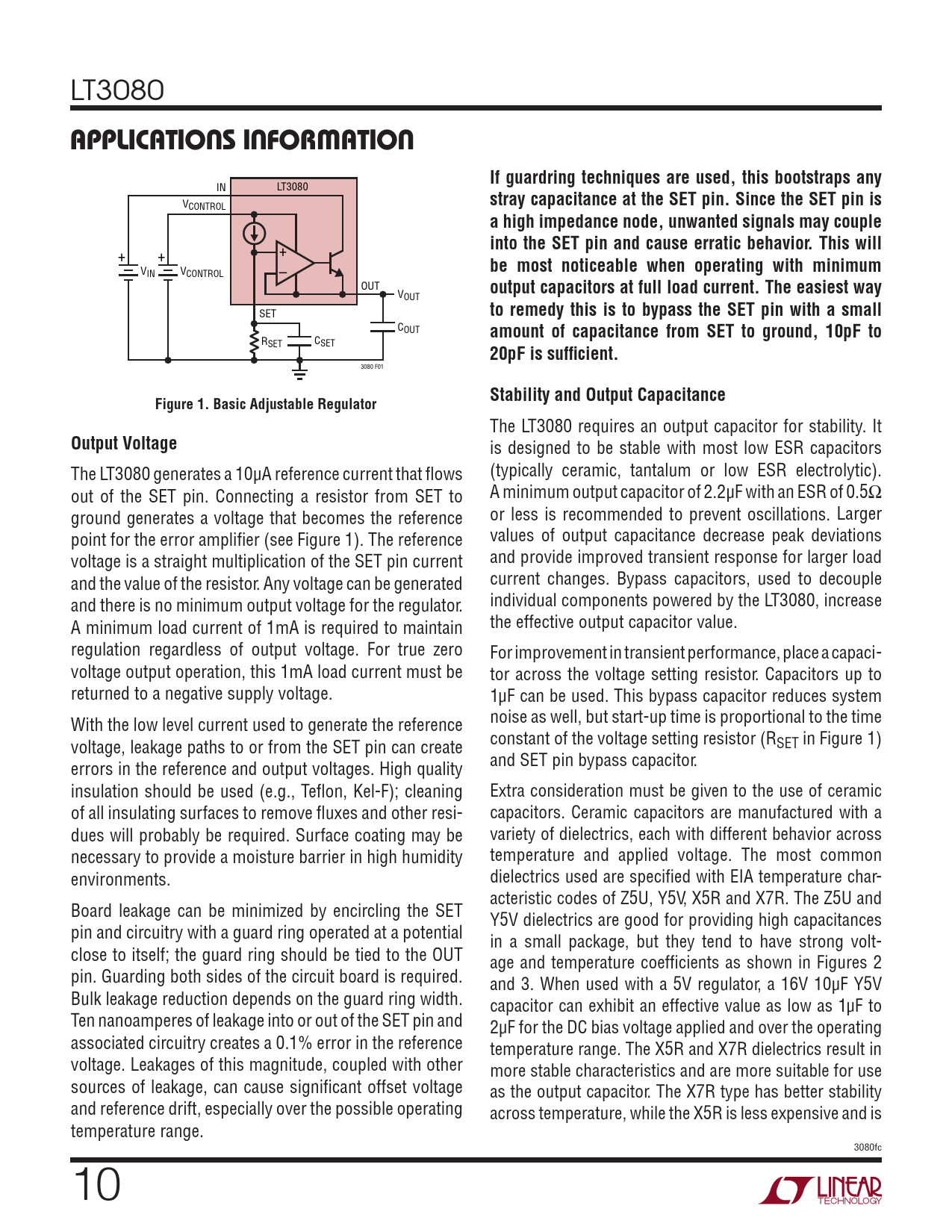 LT3080 applicaTions inForMaTionIf guardring techniques are used, this bootstraps any IN LT3080 V stray capacitance at the SET pin. Since the SET pin is CONTROL a high impedance node, unwanted signals may couple + into the SET pin and cause erratic behavior. This will + + V be most noticeable when operating with minimum IN VCONTROL – OUT output capacitors at full load current. The easiest way VOUT SET to remedy this is to bypass the SET pin with a small COUT amount of capacitance from SET to ground, 10pF to RSET CSET 20pF is sufficient. 3080 F01 Figure 1. Basic Adjustable RegulatorStability and Output Capacitance The LT3080 requires an output capacitor for stability. It Output Voltage is designed to be stable with most low ESR capacitors The LT3080 generates a 10µA reference current that flows (typically ceramic, tantalum or low ESR electrolytic). out of the SET pin. Connecting a resistor from SET to A minimum output capacitor of 2.2µF with an ESR of 0.5Ω ground generates a voltage that becomes the reference or less is recommended to prevent oscillations. Larger point for the error amplifier (see Figure 1). The reference values of output capacitance decrease peak deviations voltage is a straight multiplication of the SET pin current and provide improved transient response for larger load and the value of the resistor. Any voltage can be generated current changes. Bypass capacitors, used to decouple and there is no minimum output voltage for the regulator. individual components powered by the LT3080, increase A minimum load current of 1mA is required to maintain the effective output capacitor value. regulation regardless of output voltage. For true zero For improvement in transient performance, place a capaci- voltage output operation, this 1mA load current must be tor across the voltage setting resistor. Capacitors up to returned to a negative supply voltage. 1µF can be used. This bypass capacitor reduces system With the low level current used to generate the reference noise as well, but start-up time is proportional to the time voltage, leakage paths to or from the SET pin can create constant of the voltage setting resistor (RSET in Figure 1) errors in the reference and output voltages. High quality and SET pin bypass capacitor. insulation should be used (e.g., Teflon, Kel-F); cleaning Extra consideration must be given to the use of ceramic of all insulating surfaces to remove fluxes and other resi- capacitors. Ceramic capacitors are manufactured with a dues will probably be required. Surface coating may be variety of dielectrics, each with different behavior across necessary to provide a moisture barrier in high humidity temperature and applied voltage. The most common environments. dielectrics used are specified with EIA temperature char- acteristic codes of Z5U, Y5V, X5R and X7R. The Z5U and Board leakage can be minimized by encircling the SET Y5V dielectrics are good for providing high capacitances pin and circuitry with a guard ring operated at a potential in a small package, but they tend to have strong volt- close to itself; the guard ring should be tied to the OUT age and temperature coefficients as shown in Figures 2 pin. Guarding both sides of the circuit board is required. and 3. When used with a 5V regulator, a 16V 10µF Y5V Bulk leakage reduction depends on the guard ring width. capacitor can exhibit an effective value as low as 1µF to Ten nanoamperes of leakage into or out of the SET pin and 2µF for the DC bias voltage applied and over the operating associated circuitry creates a 0.1% error in the reference temperature range. The X5R and X7R dielectrics result in voltage. Leakages of this magnitude, coupled with other more stable characteristics and are more suitable for use sources of leakage, can cause significant offset voltage as the output capacitor. The X7R type has better stability and reference drift, especially over the possible operating across temperature, while the X5R is less expensive and is temperature range. 3080fc 10 Document Outline Features Applications Description Typical Application Absolute Maximum Ratings Pin Configuration Order Information Electrical Characteristics Typical Performance Characteristics Pin Functions Block Diagram Applications Information Typical Applications Package Description Revision History Typical Application Related Parts